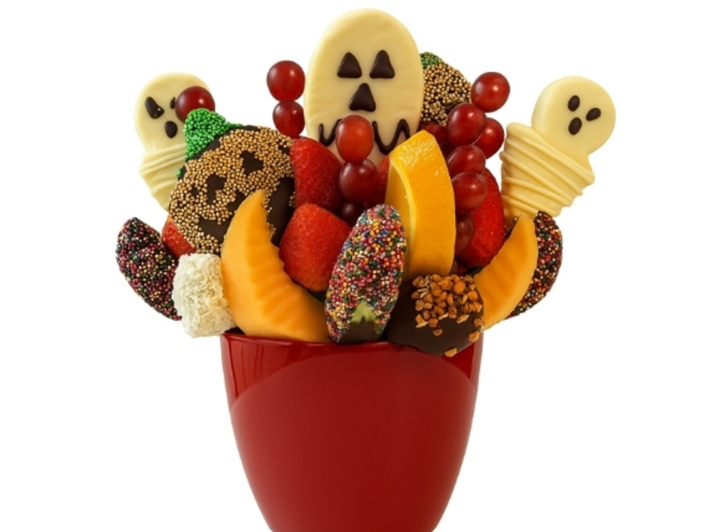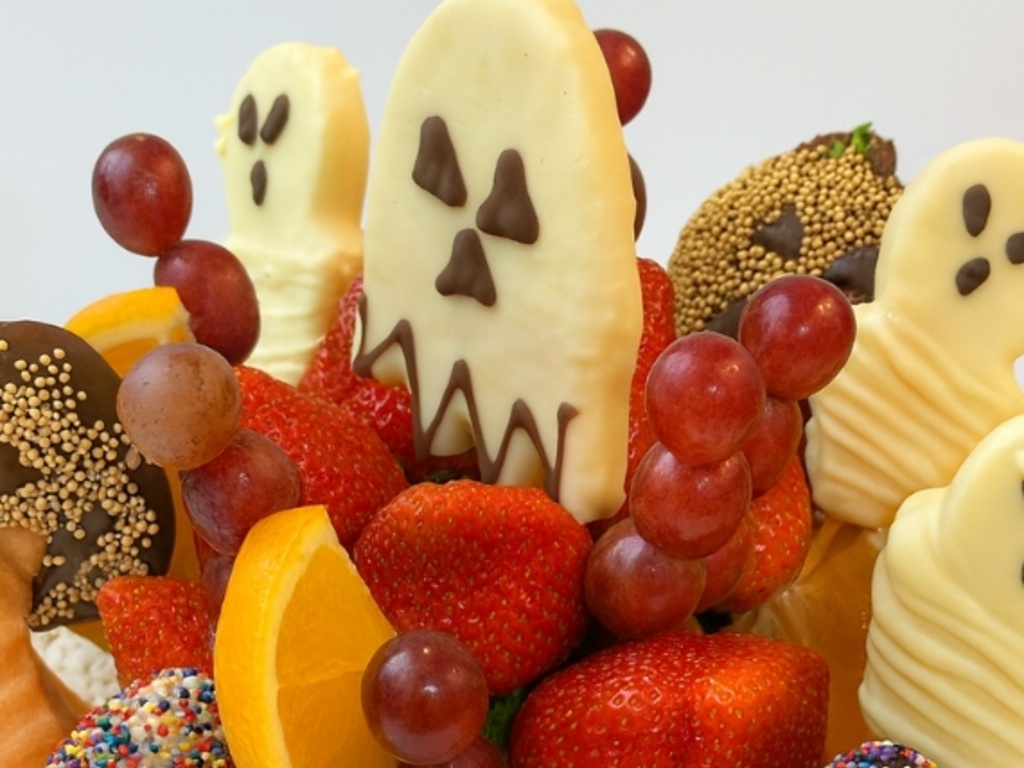 Z čerstvého ovocia, jahôd v belgickej čokoláde, strašidelných tekvičiek a duchov z bielej čokolády vytvárame jedinečný jedlý aranžmán, ktorý poteší deti aj dospelých.