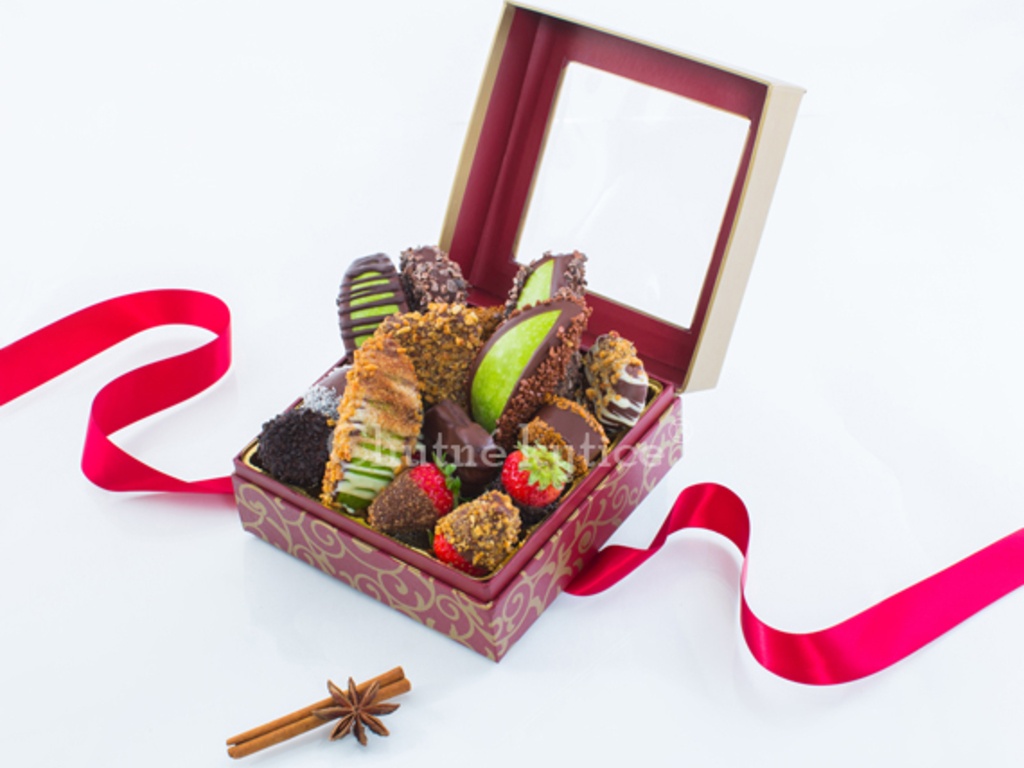 Ovocie v čokoláde je určené na okamžitú spotrebu. Pri skladovaní v chlade najlepšie spotrebujte najlepšie do 2 dní. Bonboniéra môže byť dodaná v rovnakom type darčekovej krabičky s odlišným vzorom a stuhou.