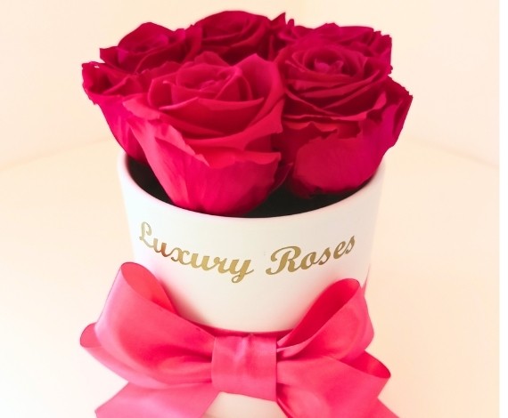 Trvácne ruže, 5 ks v bielej alebo čiernej luxusnej krabičke podľa dostupnosti. Tieto ruže prešli procesom stabilizácie- sú živé, chemicky ošetrené a vydržia nádherné a ako čerstvé aj niekoľko rokov. Farba ruží: červené, ružové, cyklaménové podľa aktuálnej dostupnosti.