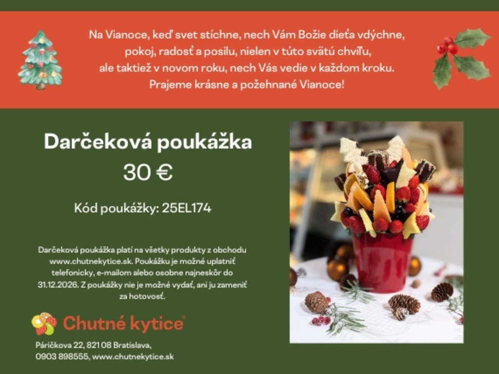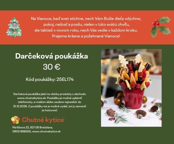 Poukážka môže mať hodnotu 30 € (novinka!), 50 € alebo 100 €. Platnosť je časovo obmedzená maximálne na 12 mesiacov.