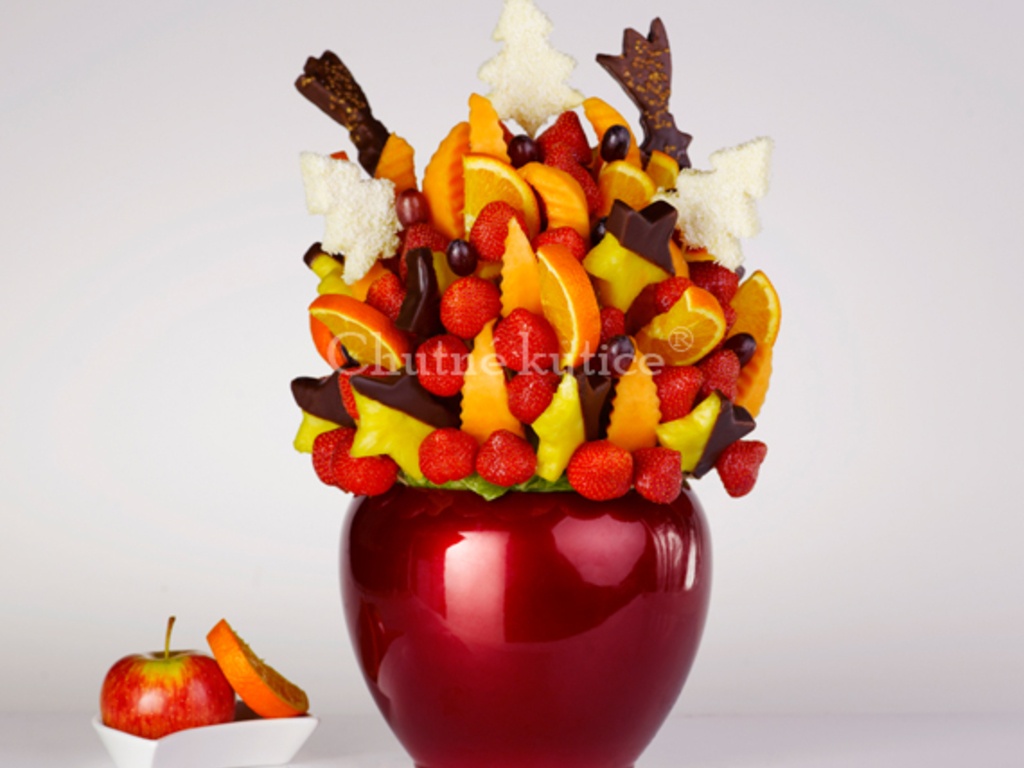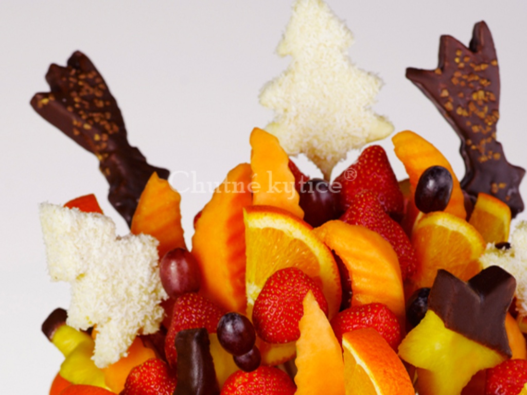Chutná kytica špeciálne pre zimné dni: každoročný zimný hit sezóny znova v ponuke! Vychutnajte si ananásové hviezdy s pravou belgickou alebo talianskou čokoládou, pomaranče, sladký melón kantalup, hrozno a jahody, ktoré sú v Chutných kyticiach skvelé a čerstvé v každej sezóne.