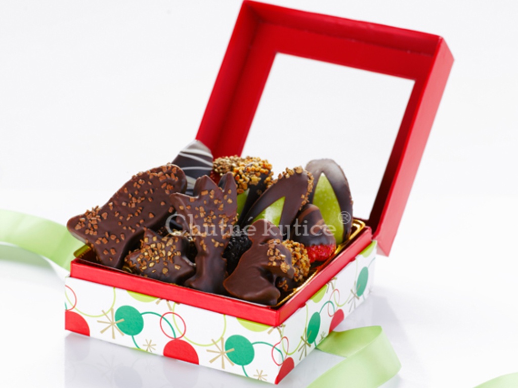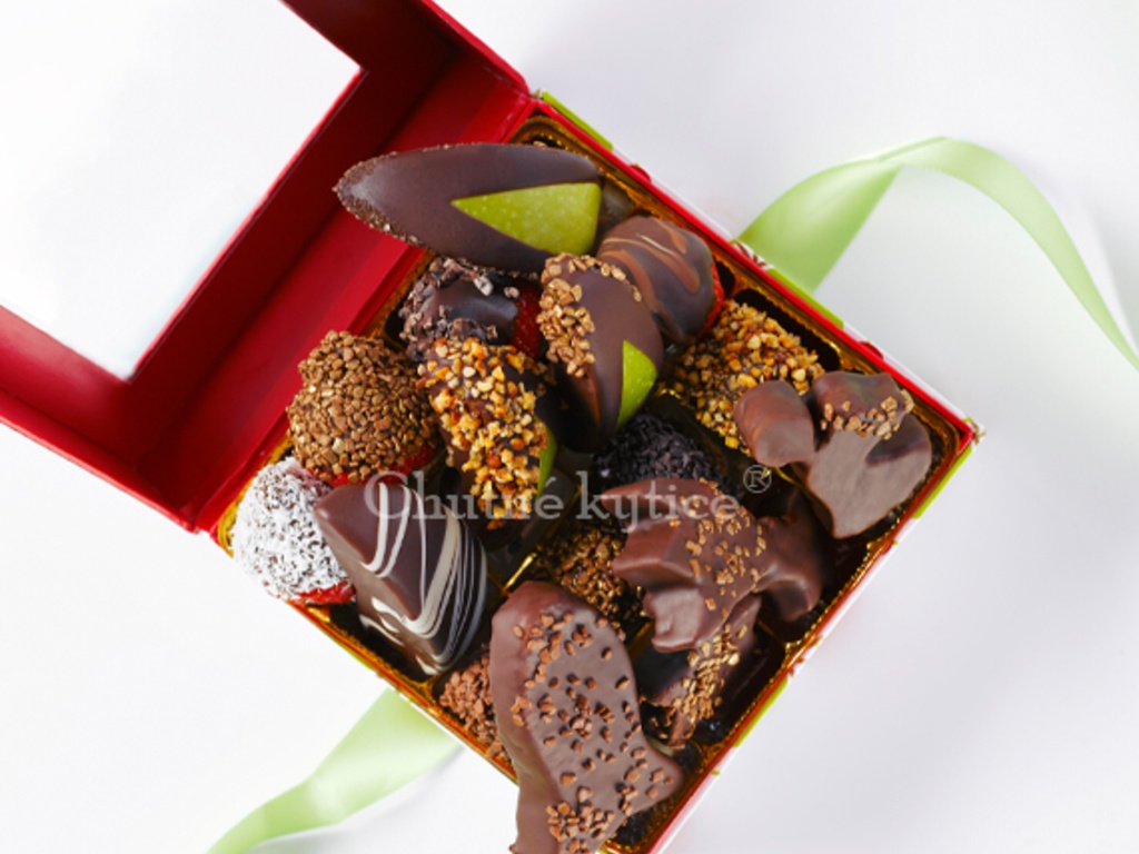 Exkluzívna bonboniéra v luxusnej krabičke aj na zimný a vianočný čas. V obľúbenom ovocí v čokoláde v tejto sezónnej edícii nájdete z ananásu vyrezaného anjelika, hviezdičku, rybku aj kométu. Okrem sladkého ananásu ručne namáčame do pravej belgickej alebo talianskej čokolády kolieska banánu, mesiačiky zeleného jablka (odroda Granny Smith) a jahody.