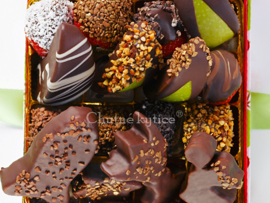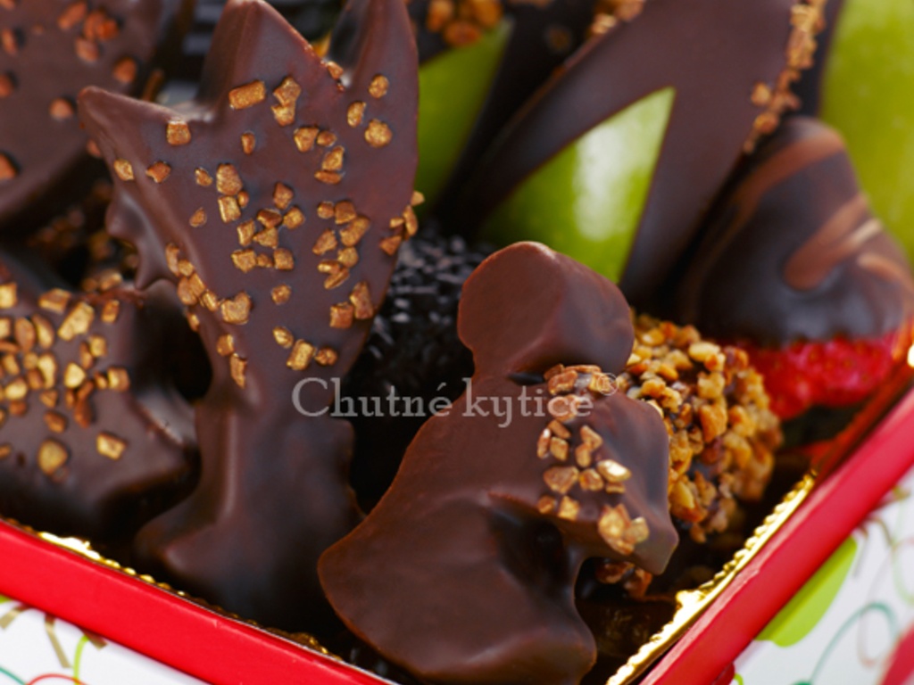 Ovocno-čokoládové kúsky ešte zdobíme ďalšími dobrotami: karamelizovanými mletými lieskovými orechami, kokosom, škoricovým cukrom, mliečnymi a horkými čokoládovými vločkami a kúskami pražených kakaových zŕn či efektne inou čokoládou. Niektoré zo zimných a vianočných motívov sú nazdobené čokoládovými vločkami so zlatým popraškom.